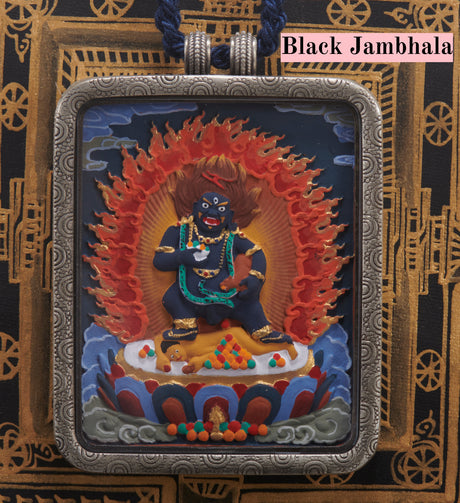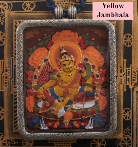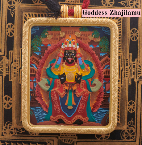 Gold-Toned Tibetan Treasure Scrollwork Tsa-Tsa Thangka Pendant-Goddess Zhajilamu
