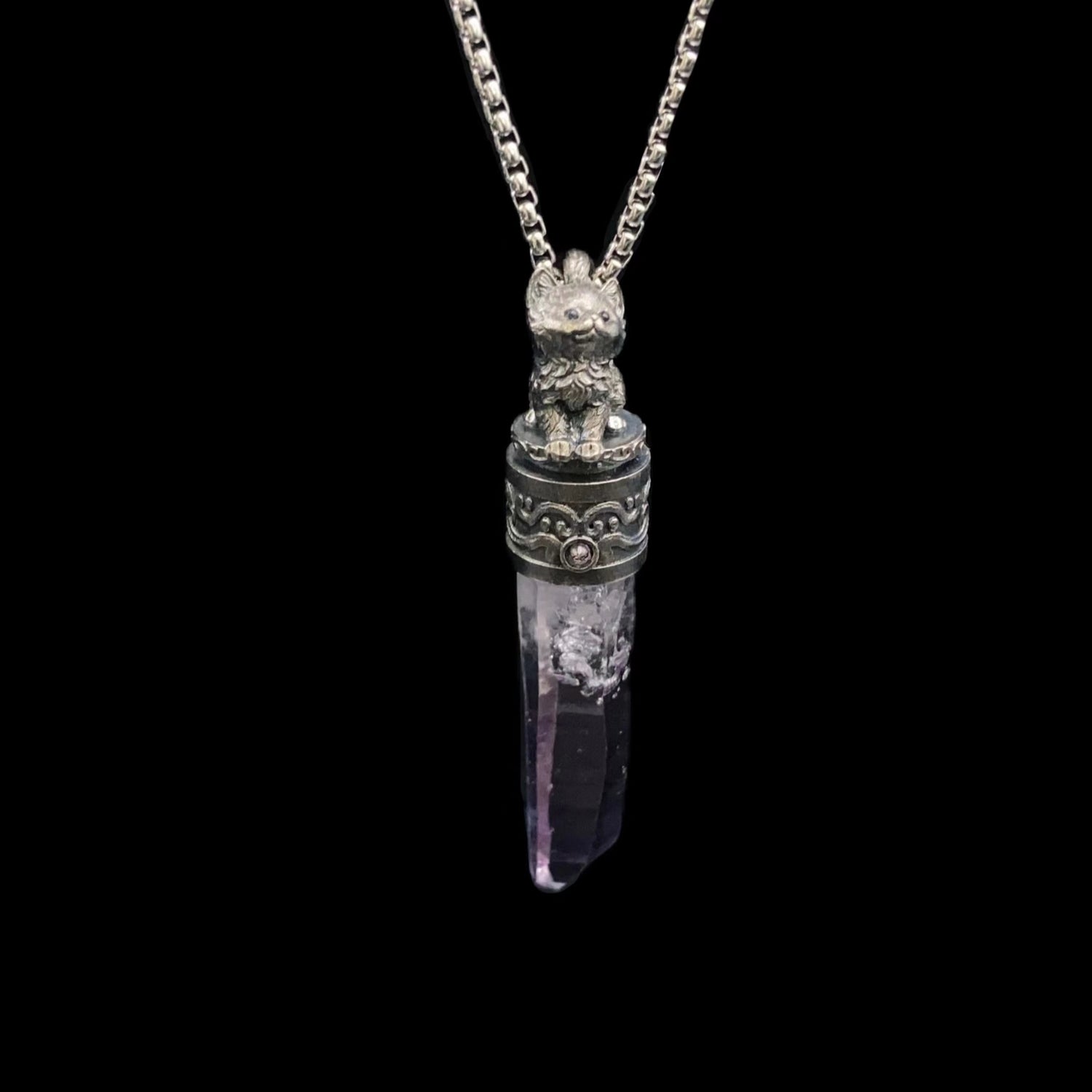This pendant is an exquisite piece of jewelry combining silver and crystal, rich in details and boasting a unique style. Its main body is crafted from 925 silver, with a vintage finish on the surface, exuding a strong retro charm. Below it is paired with a natural amethyst, featuring a clear crystal body.