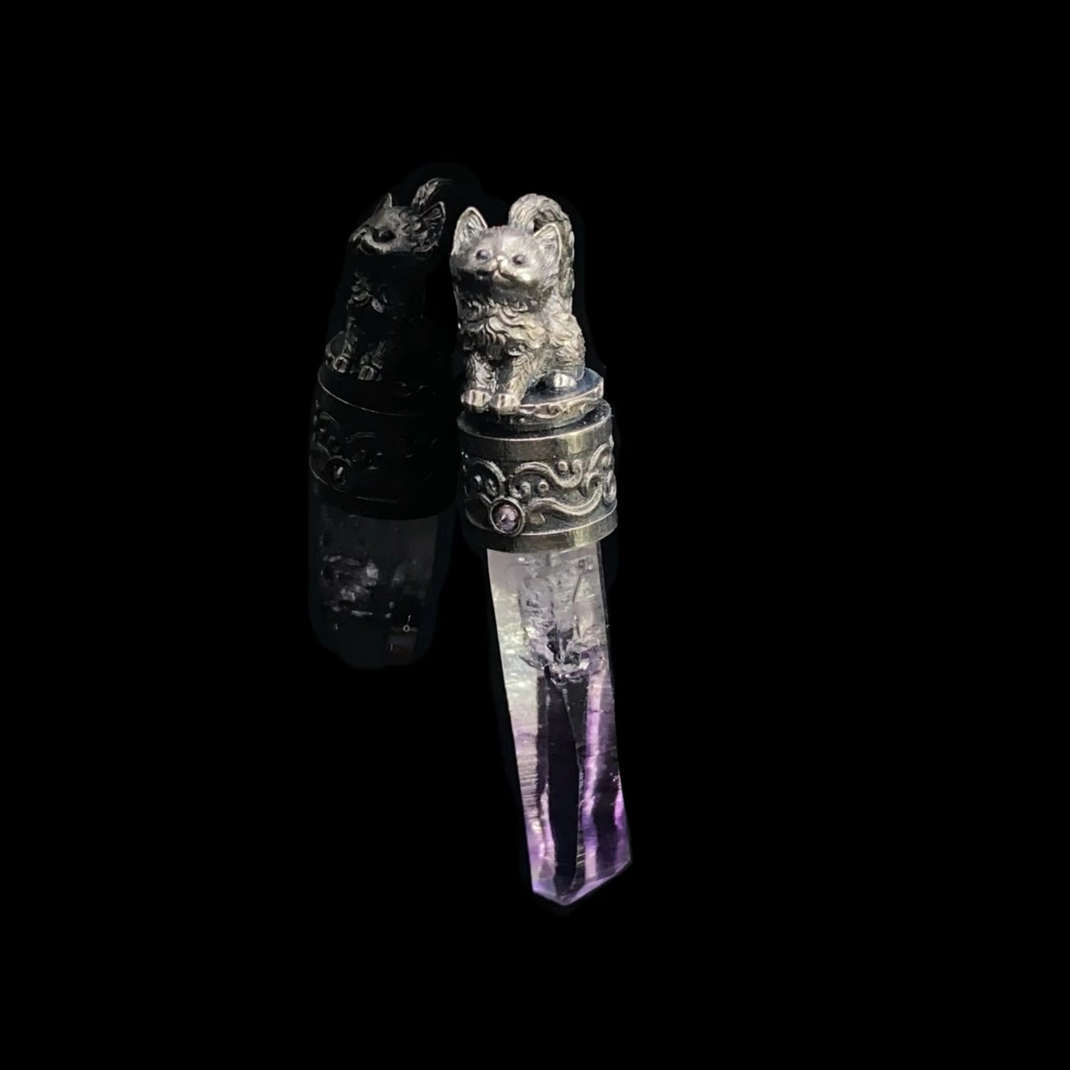 At the top is a silver sculpture of a nine-tailed fox. The fox has a lively expression, with distinct hair textures and clearly layered tails, exuding both playfulness and mystery. Beneath the silver ring is an amethyst column in a typical cluster tip shape, whose purple hue is faintly visible under light.