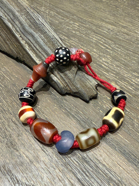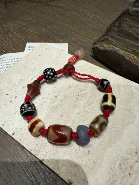Red-Cord Agate Bracelet with Dzi Accents and Carved Charm