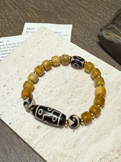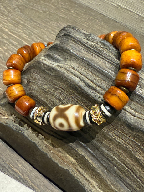 Tranquility & Wisdom – Mongolian Turquoise & Amber & Dzi Bead Bracelet