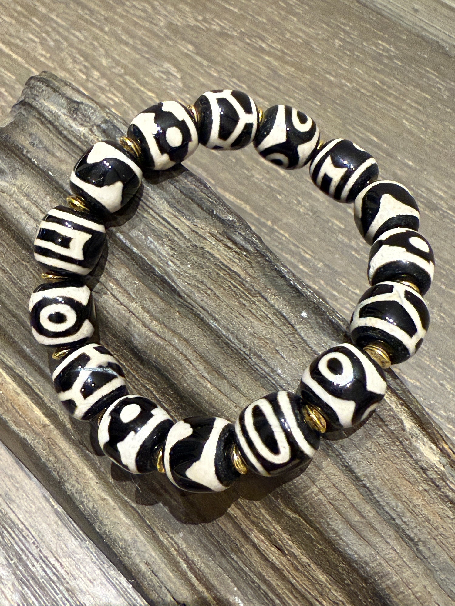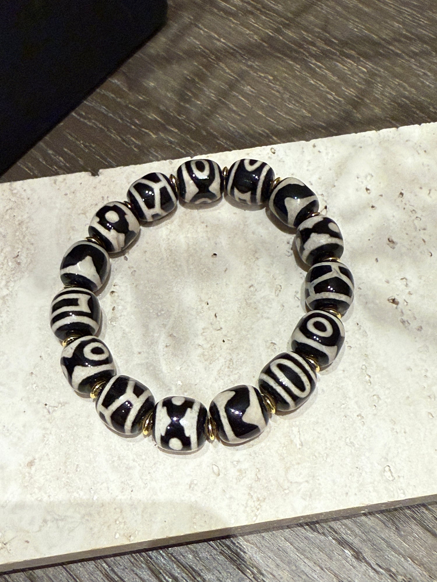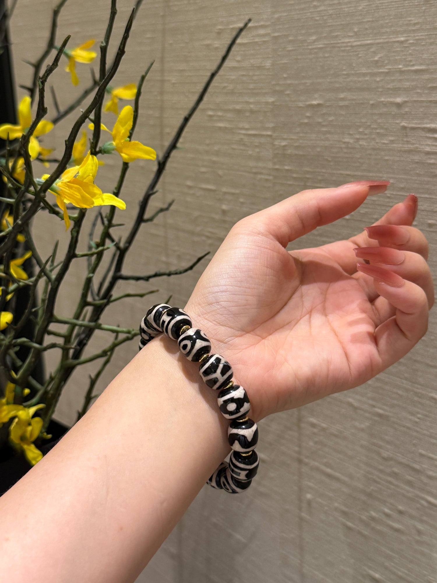 The core material of the bracelet is agate, which has  warm and smooth and delicate texture. On the black and white agate beads, the dzi bead patterns are clear and rhythmic, like mysterious symbols left by time, full of ancient cultural atmosphere. The golden accessories play the role of connecting and brightening, implying nobility and light. In cultural imagery, dzi beads symbolize the transmission of sacred protection and ancient wisdom. Agate itself is believed to bring courage and protection, while dzi beads carry the beautiful wishes of warding off evil and disasters and inspiring wisdom. Wearing this bracelet, it seems as if one can resonate with ancient wisdom, protect a stable and smooth life, and allow the soul to find a world of tranquility and wisdom in the complexity.