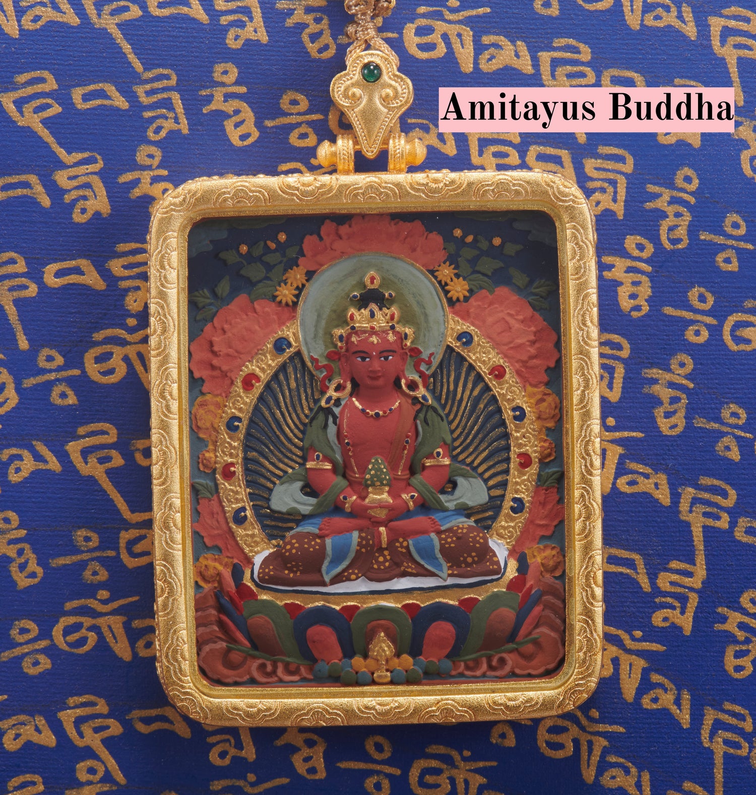 This is an exquisitely crafted Amitayus Buddha thangka pendant. In Buddhism, Amitayus Buddha is the emanation of Amitabha Buddha , primarily symbolizing the granting of long life to all beings. Wearing an Amitayus Buddha thangka pendant reflects the prayer for his protection: to grant oneself and one’s family extended lifespans, shield them from illness and accidents, maintain good health, and enjoy a long, stable life.