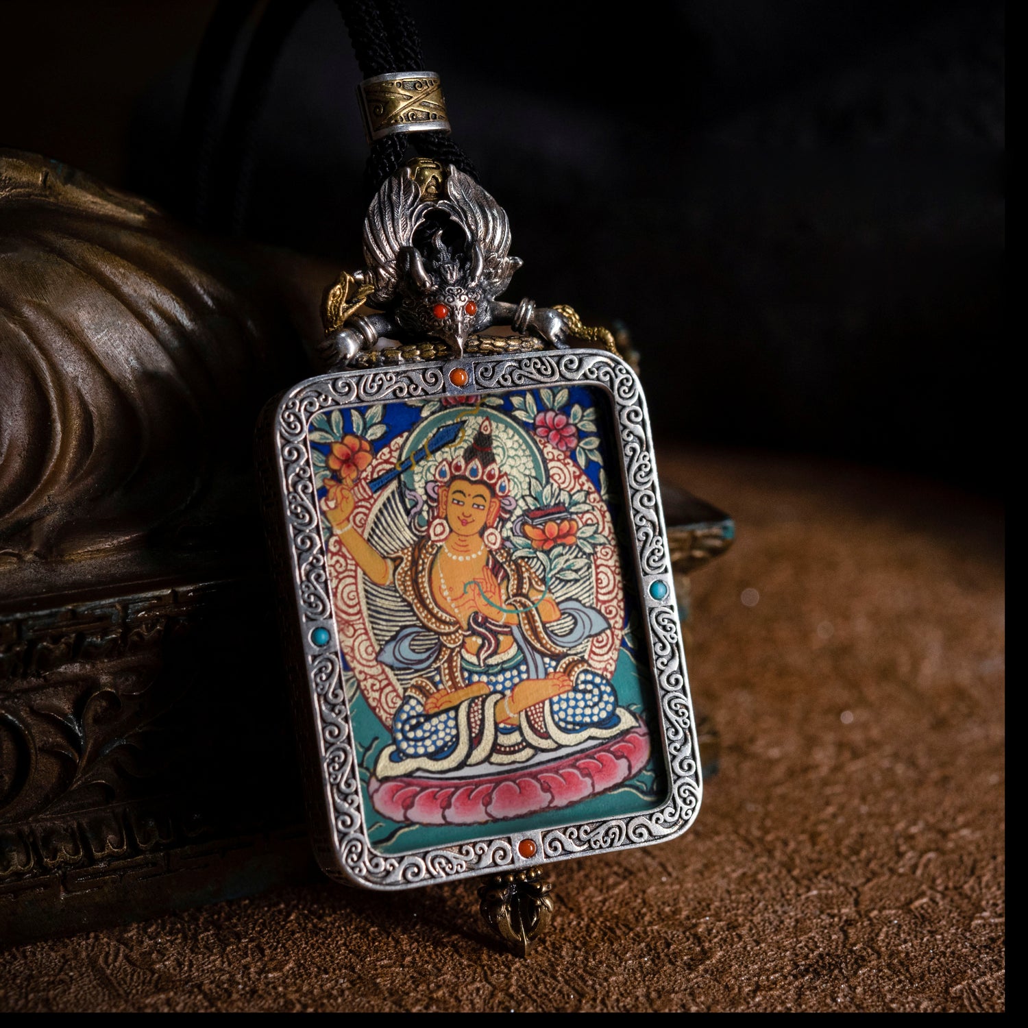 This Thangka pendant is based on S925 silver, with brass relief patterns embossed on its surface. Natural Nanhong and Natural Turquoise are symmetrically inlaid. The interplay between metals and gemstones brings out both a rustic texture and an air of noble elegance.At the top is a garuda design, with a sharp beak and spread wings, symbolizing subduing external evils and taming inner demons.