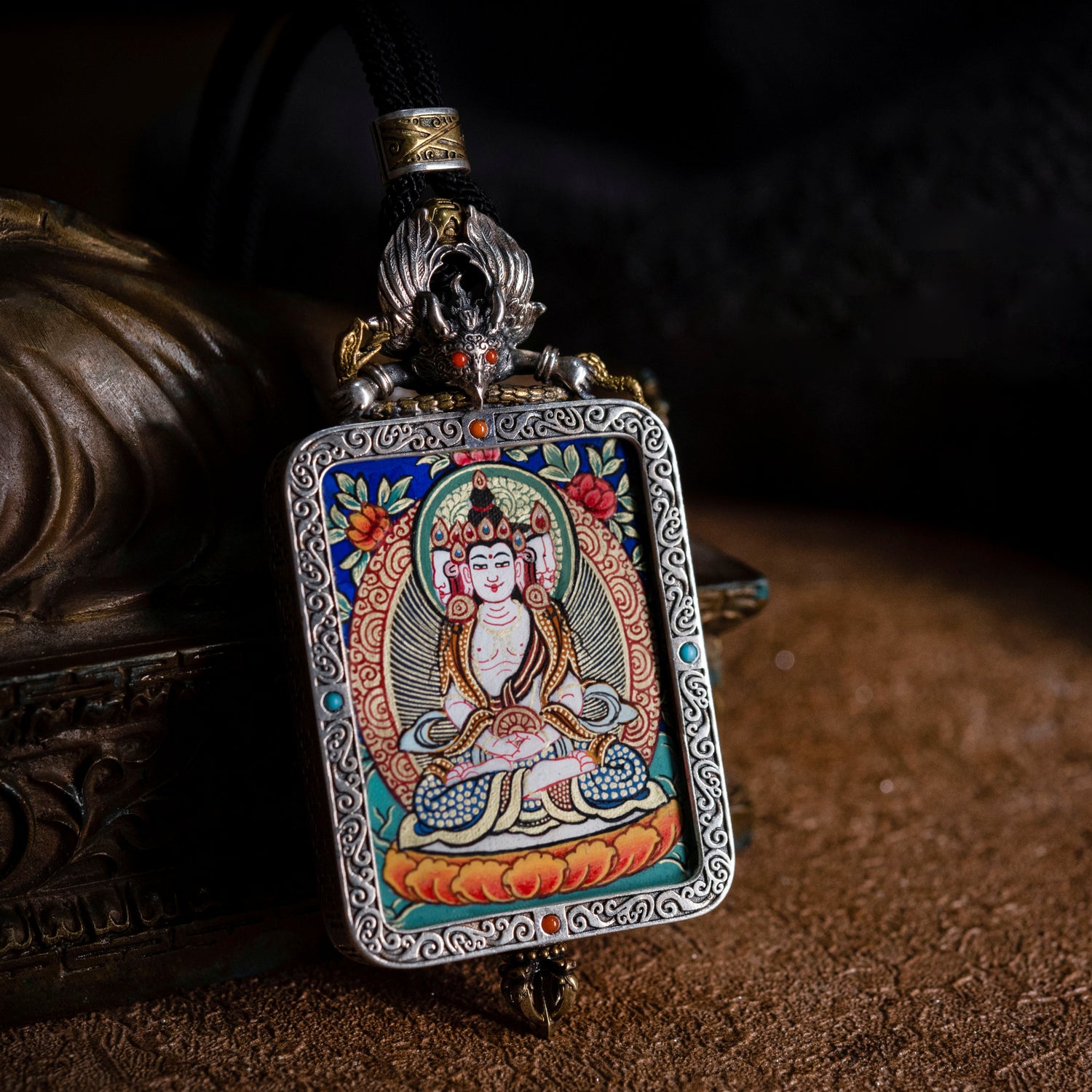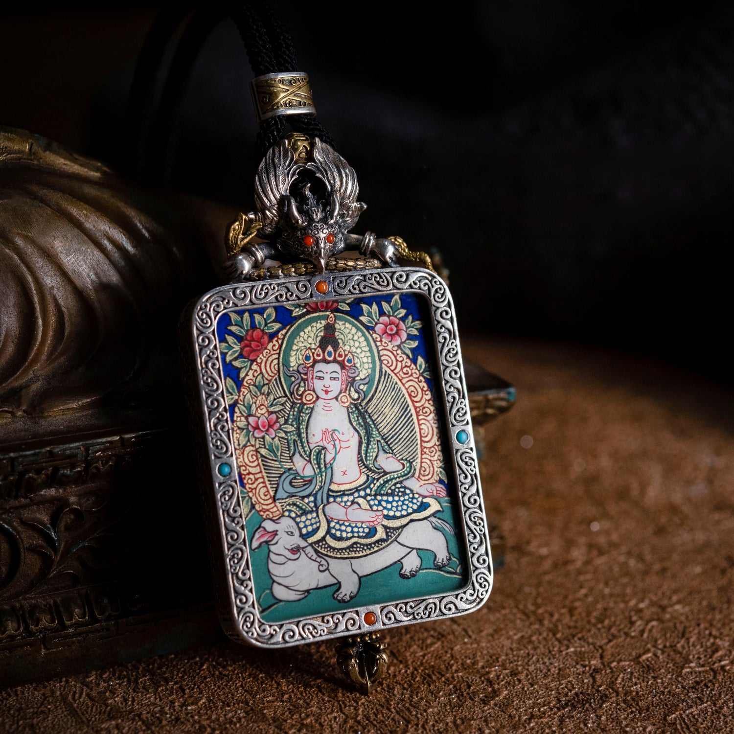 This Thangka pendant is based on S925 silver, with brass relief patterns embossed on its surface. Natural Nanhong and Natural Turquoise are symmetrically inlaid. The interplay between metals and gemstones brings out both a rustic texture and an air of noble elegance.At the top is a garuda design, with a sharp beak and spread wings, symbolizing subduing external evils and taming inner demons.
